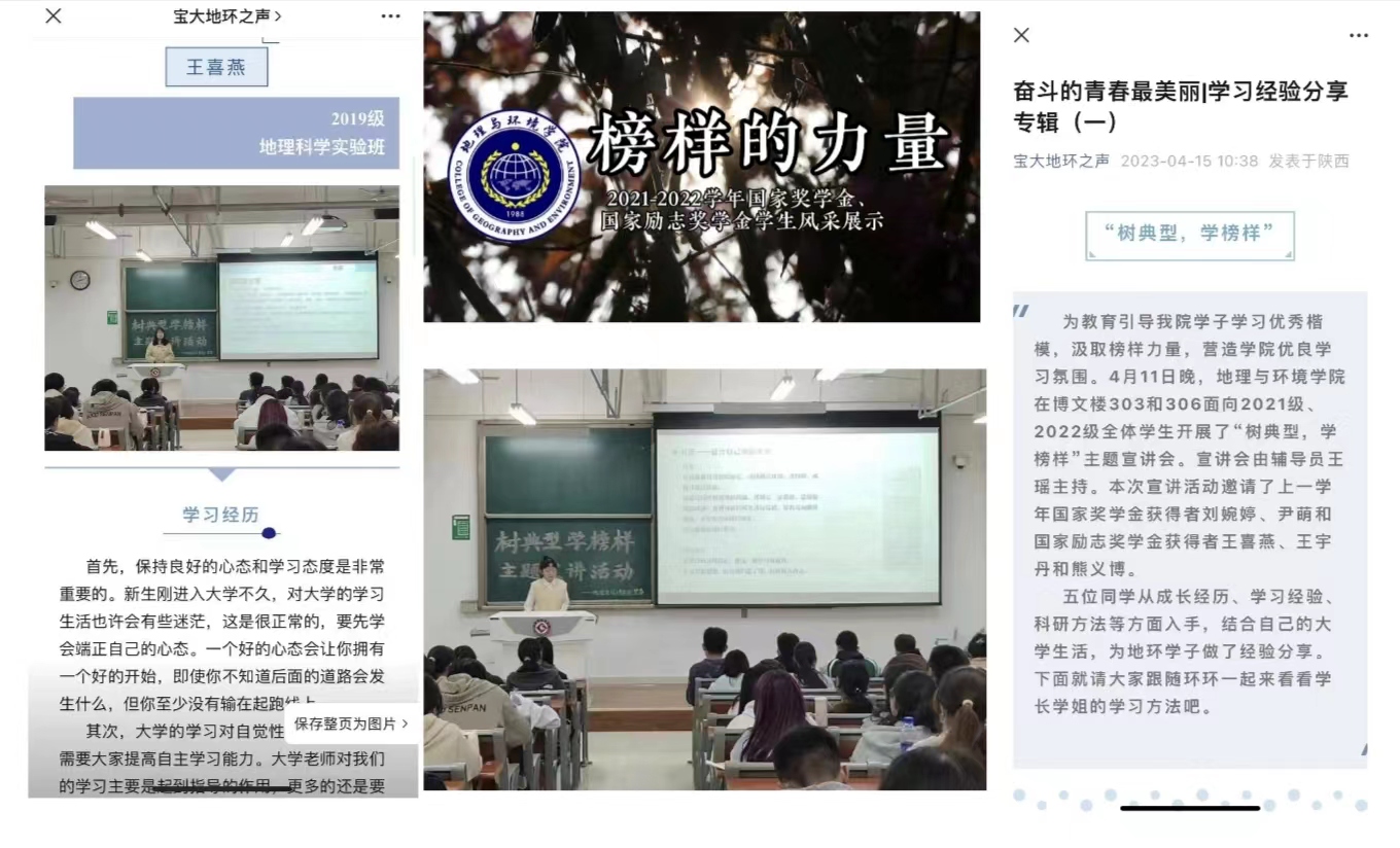 线上线下,同步发力。4月11日,公司在高新校区博文楼303和306教室邀请“获奖员工优秀事迹宣讲团”成员走进班级,与2021级、2022级员工开展面对面交流。宣讲团成员从成长经历、学习科研、考研经验等方面入手,为地环学子做了经验分享。公司利用新媒体平台积极宣传,在微信公众号“宝大地环之声”,连续多期推出了《国奖故事|追光逐梦 不负韶华》《奋斗的青春最美丽|学习经验分享专辑》和《青春风采 榜样力量|国励风采榜》等特辑。公司将2021-2022学年国家奖学金和国家励志奖学金获得者优秀事迹在明理楼一楼循环展示播放,为公司“树典型 学榜样”系列活动起到了积极的宣传作用,营造了比学赶超、奋发向上的浓厚氛围。